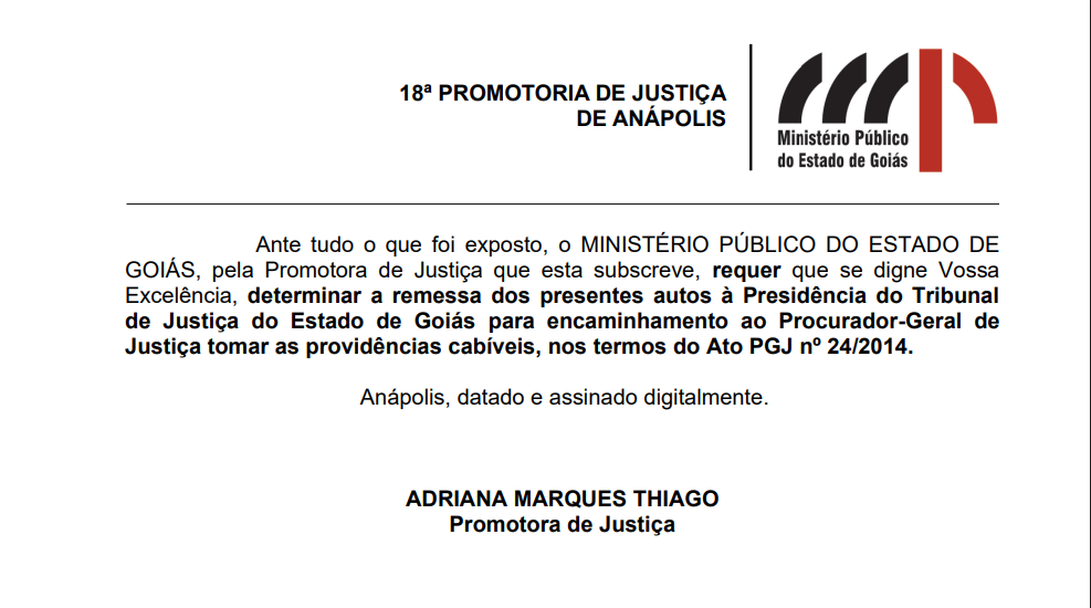 “Ante tudo o que foi exposto, o MINISTÉRIO PÚBLICO DO ESTADO DE GOIÁS, pela Promotora de Justiça que esta subscreve, requer que se digne Vossa Excelência, determinar a remessa dos presentes autos à Presidência do Tribunal de Justiça do Estado de Goiás para encaminhamento ao Procurador-Geral de Justiça tomar as providências cabíveis, nos termos do Ato PGJ nº 24/2014”, diz o despacho de Adriana Thiago.