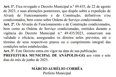 Por decisão do prefeito Márcio Corrêa (PL), foi revogado o Decreto 49.435/2023. A oficialização desta suspensão foi feita no Diário Oficial de 30 de junho. O documento garantia algumas condições para que contribuintes, sejam empresas ou pessoas físicas, conseguissem o alvará condicionado de funcionamento ou de construção.