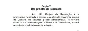 Entre as possíveis irregularidades apontadas pelo ex-procurador do Poder Legislativo, Carlos Alberto Lima, e pelo ex-Procurador Geral do Município, Carlos Alberto Fonseca, está o ferimento ao Artigo 101 do Regimento Interno. O texto indica que os assuntos de natureza financeira, político-administrativa devem ser feitos por Projeto de Resolução, e são de competência exclusiva da Mesa Diretora.