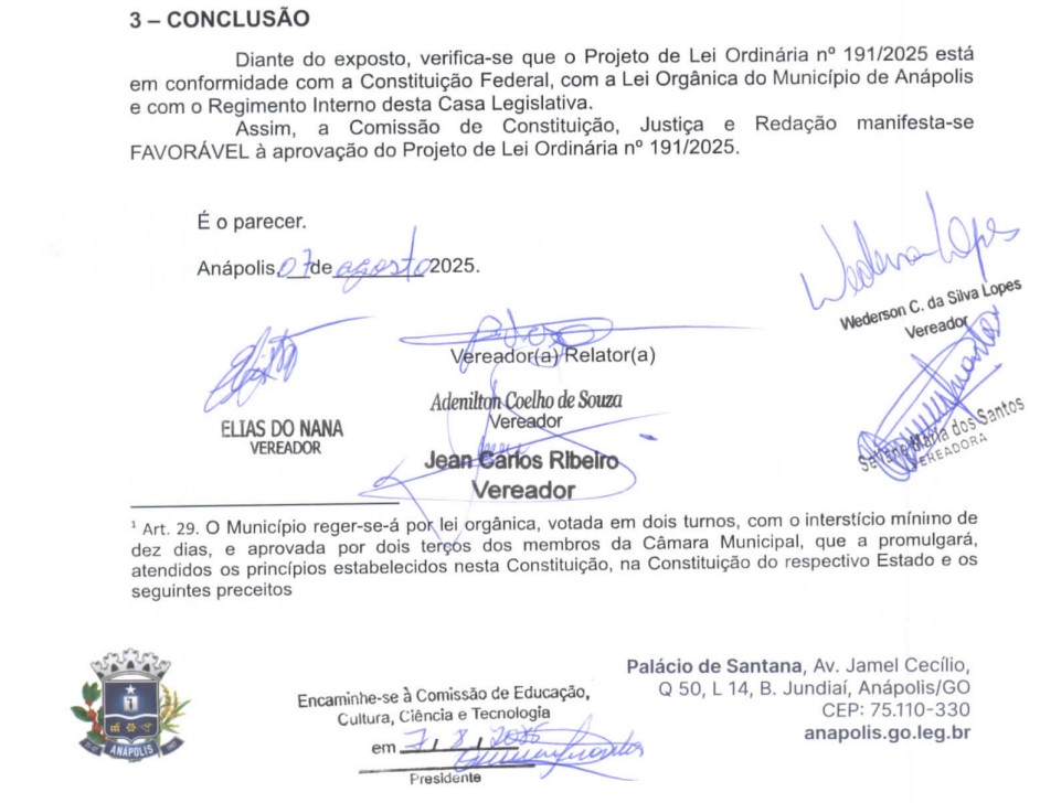 No parecer do projeto, o vereador-relator Leitão do Sindicato (PSD) afirma que o Projeto de Lei Ordinária 191/2025 “está em conformidade com a Constituição Federal, com a Lei Orgânica do Município de Anápolis e com o Regimento Interno da Câmara Municipal desta casa Legislativa”.