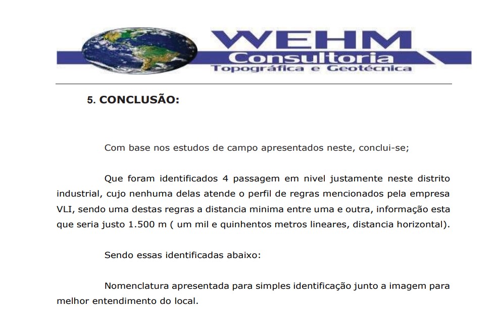 Isto porque, conforme o relatório técnico apresentado pela WEHM, na Rua R2, “entre o restaurante sol nascente e a plataforma logística multimodal” há uma passagem fora dos padrões da FCA.