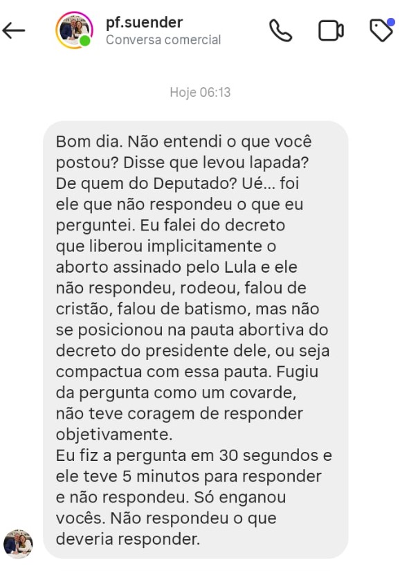 Só que Suender não esperava a resposta que recebeu de Rubens Otoni na última terça-feira (12), quando indagou o deputado federal sobre um decreto legislativo que trata de nomenclaturas. Na interpretação de Suender, os nomes usados no documento gerariam a flexibilização do aborto.