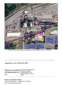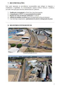 Na vistoria técnica, verificou-se que: o espaço está pavimentado e integrado ao uso operacional do Porto Seco. Do mesmo modo, não existe sinalização horizontal e vertical adequada, em desacordo com a NBR 14644 e o Código de Trânsito Brasileiro (Lei nº 9.503/1997). Por fim, indica o laudo, a área é utilizada de forma contínua, visível a qualquer interessado, logo na entrada do empreendimento.
