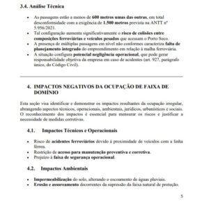 O documento ainda identifica que existem três passagens em nível consecutivas, “em desconformidade com a Resolução ANTT nº 5.956/2021, que estabelece distância mínima de 1.500 metros entre cruzamentos ferroviários, salvo autorização expressa da concessionária e da Agência Reguladora”.