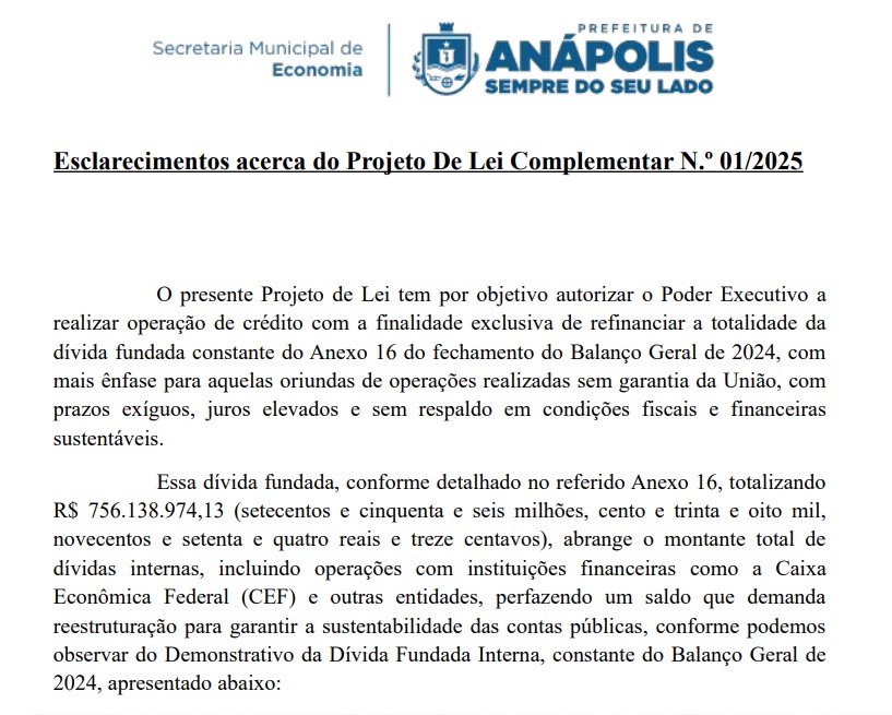 “A operação de crédito tem finalidade exclusiva de refinanciar a totalidade da dívida fundada constante do Anexo 16 do fechamento do Balanço Geral de 2024”, afirma o secretário em documento técnico que traz explicações sobre a demanda do PLC 01/2025.