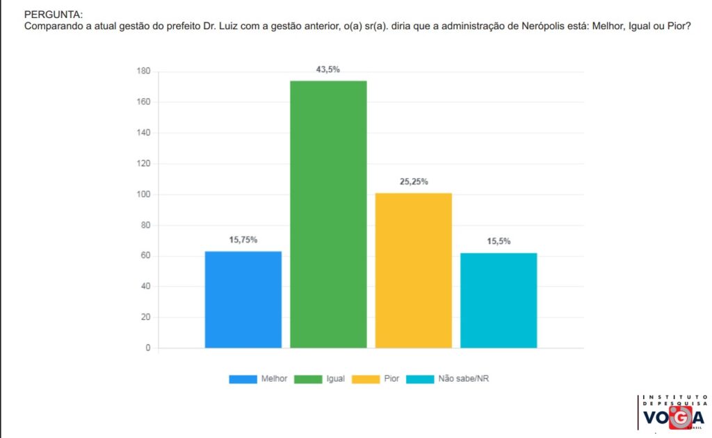 Já para 15,75% dos cidadãos neropolinos, a atual administração de Dr. Luiz é superior à anterior, entregando mais e melhores resultados. Somente um quarto dos entrevistados consideram que o governo municipal é pior. E o restante não soube ou não quis responder.