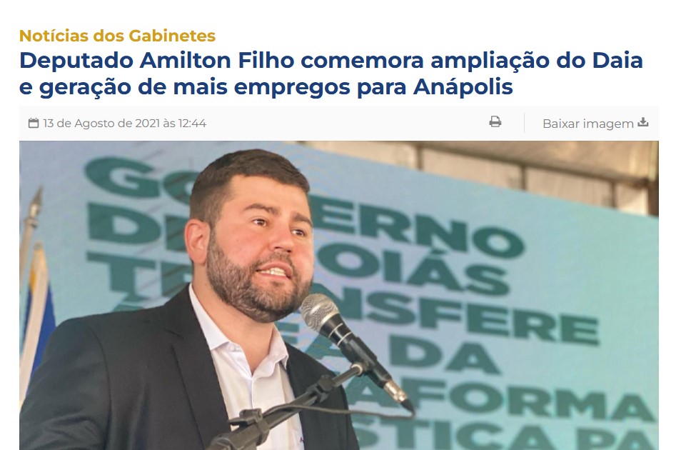 “Estou muito feliz em ver o sonho de ampliação do Daia se concretizando”, celebrou o deputado estadual Amilton Filho. Em 2021, Amilton comemorou a cessão da área da Plataforma Logística (outro engodo que Anápolis carrega) para o Daia.