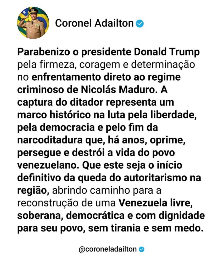 Dos representantes anapolinos na Assembleia Legislativa, apenas o deputado Coronel Adailton (SD) se manifestou. Ele parabenizou o presidente americano, que agora anunciou governar também a Venezuela. Adailton enxergou na decisão “firmeza, coragem e determinação”.