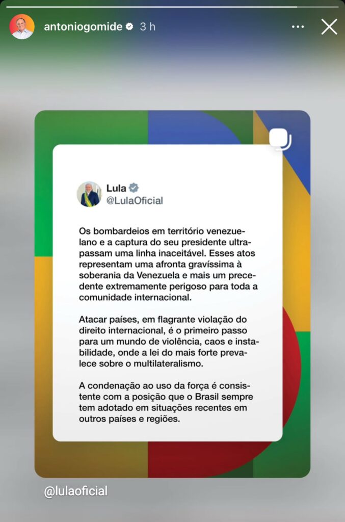 Antônio Gomide não postou um posicionamento próprio, mas reproduziu em seu perfil as declarações do presidente brasileiro. Lula condenou o ato, afirmando que a ação “ultrapassou uma linha inaceitável”.