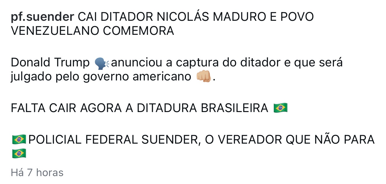 Vereador do PL, Suender Silva comemorou a ação e disse esperar que algo semelhante ocorra no Brasil, país a qual afirma viver sob uma ditadura. “Falta cair agora a ditadura brasileira”, torceu.