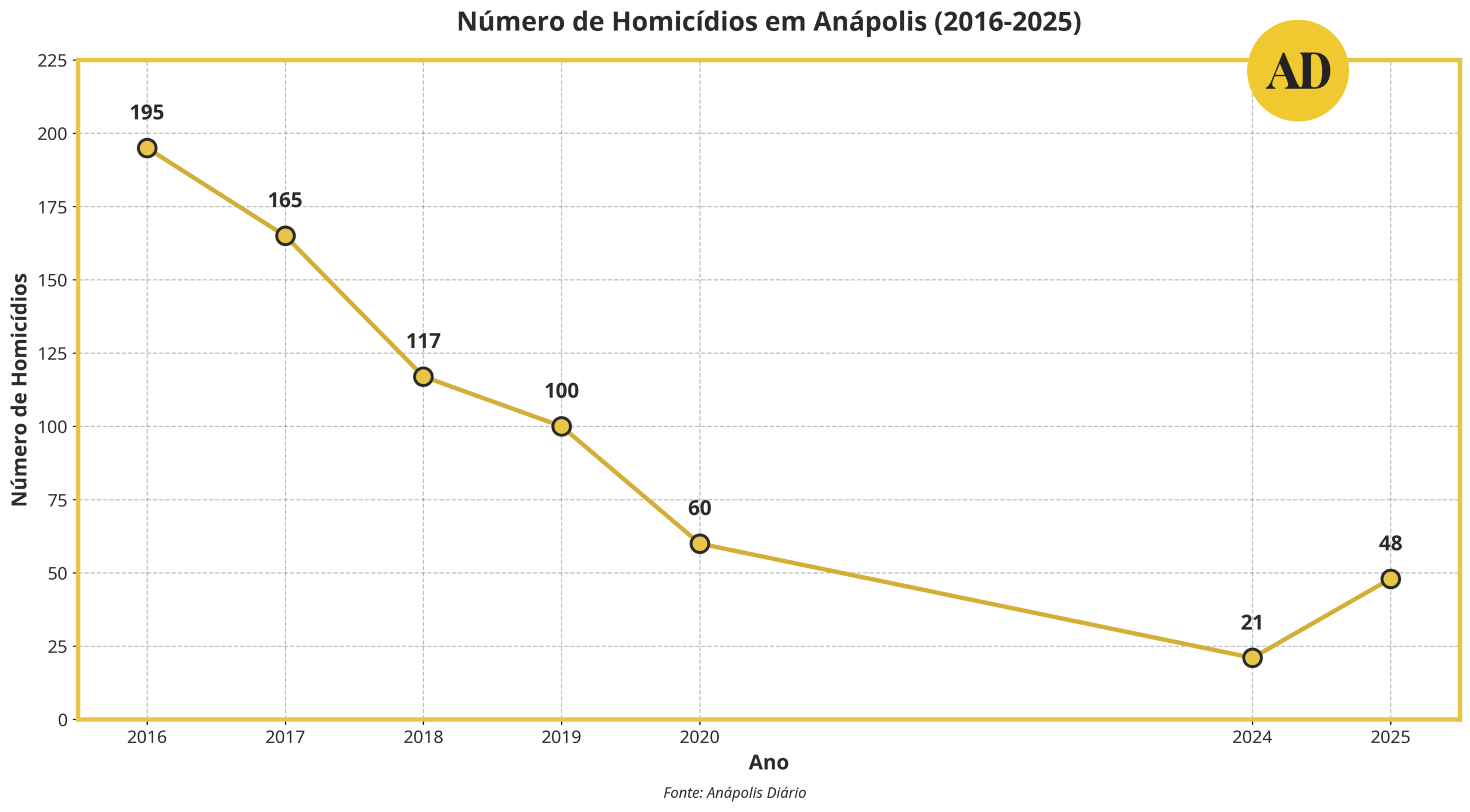“Em 2024, chegamos a um recorde de apenas 21 homicídios. É um patamar que dificilmente conseguiríamos manter. Em 2016, por exemplo, Anápolis chegou a registrar quase 200 crimes de homicídio, então houve uma redução muito expressiva ao longo dos anos”, explicou Coelho.
