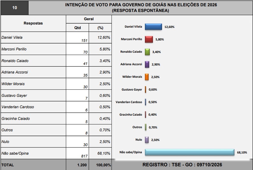 A pesquisa Directa foi registrada no TSE – GO sob o número 09710/2026. O instituto ouviu 1,2 mil eleitores em 44 cidades, entre os dias 08 a 12 de janeiro deste ano. A aferição do Instituto Directa possui Nível de Confiança de 95 % e Margem de Erro de 2,83%.