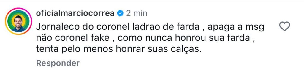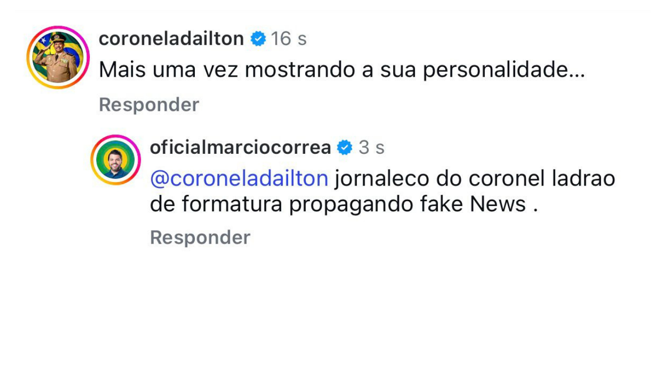 Numa postagem do jornal do pertencente ao filho do deputado estadual Coronel Adailton (Solidariedade), o prefeito de Anápolis, Márcio Corrêa, provocado pelo parlamentar, não titubeou e classificou o deputado de “ladrão de formatura”. Em seguida, continuou ampliando a suposta atuação gatuna do deputado: “honre suas calças, coronel ladrão de farda”.