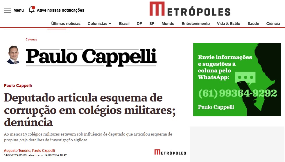 Em agosto de 2024, o colunista Paulo Capelli, do Portal Metrópoles, publicou com exclusividade o resultado de uma investigação envolvendo o deputado estadual Coronel Adailton em um esquema de corrupção, com propina e tráfico de influência, nos colégios militares de Goiás.