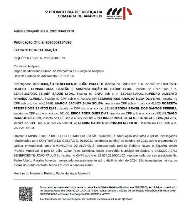 Agora é a vez do Ministério Público de Goiás (MP-GO) também abrir investigação, através da 5ª Promotoria de Justiça de Anápolis, sobre o caso envolvendo a contratação da Associação Beneficente João Paulo II pela Secretaria de Saúde. No final de fevereiro, o MP-GO decidiu ampliar ainda mais o rol de investigados a fim de apurar a responsabilidades também de fiscais do contrato.